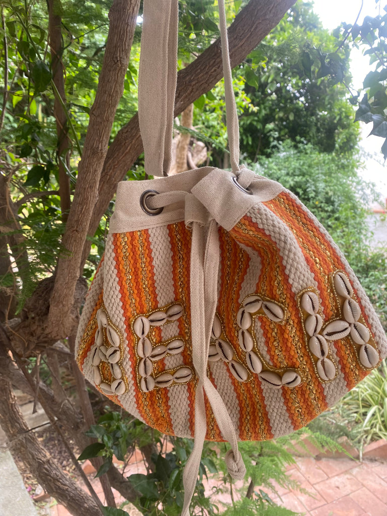Bolso tipo saco (bucket) confeccionado en tejido de algodón grueso, con una estética artesanal y veraniega. Presenta un diseño de rayas verticales en tonos blanco y naranja, combinadas con delicados hilos dorados que aportan un sutil brillo.